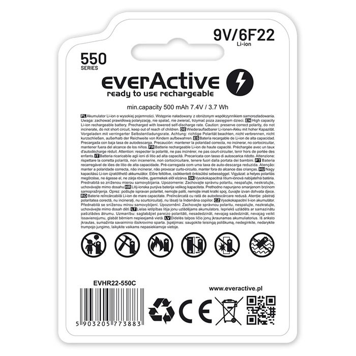 6F22/9V Li-ion. Prod. everActive. Super-pojemny akumulator w rozmiarze baterii 9V wykonany w technologii Li-ion ze zmienionym gniazdem ładowania na USB TYP C