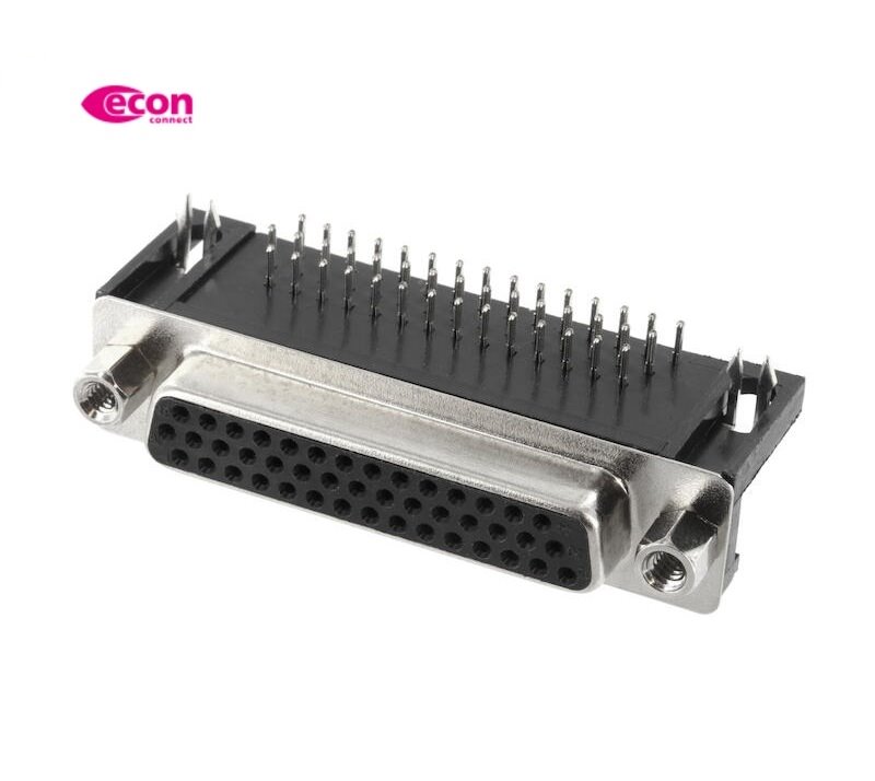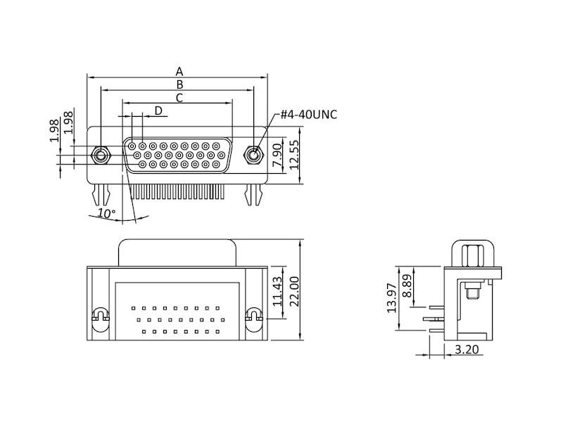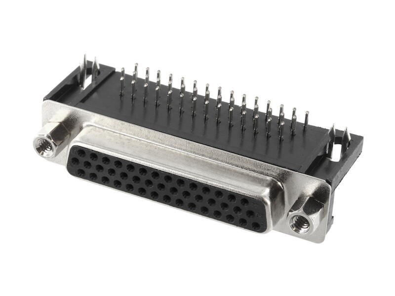 BU44HDWB Gniazdo D-SUB 44p kątowe 90° 3-rzędowe, lutowane do druku, słupek dstansowy z gwintem UNC 4-40 . Osłona złacza ze stali niklowanej z dodtkiem cyny. Izolator z PBT w kolorze czarnym. Styki kontaktu - mosiężne złocone, styki lutowane - mosiężne cynowane. A = 53.04 mm; B = 47,04 mm; C = 38.38 mm;