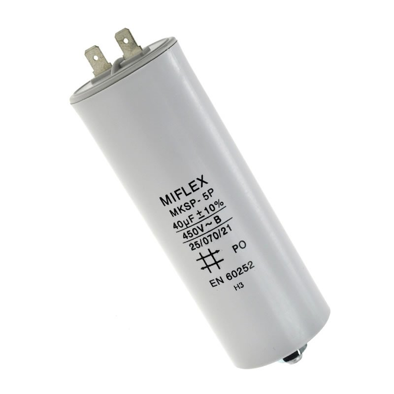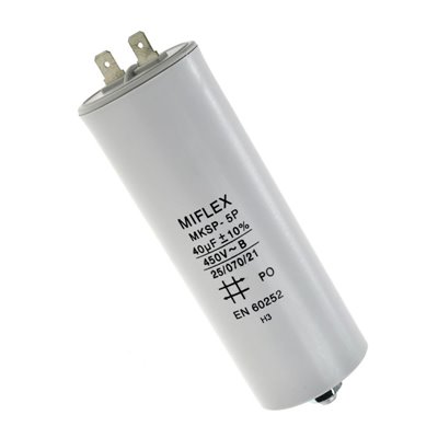 KES040/450 MK. Kondensator MKSP-5P rozruchowy do silników 40uF/450VAC +/-10% . Samoregenerujący kondensatory produkowane w obudowach z samogasnącego tworzywa wypełnionych żywicą, stosowane jako kondensatory pracy w jednofazowych silnikach elektrycznych i w obwodach prądu przemiennego o częstotliwości 50/60Hz. Spełniają wymagania normy EN60252. Odznaczają się wysoką niezawodnością i bezpieczeństwem działania. Posiadają atest VDE.